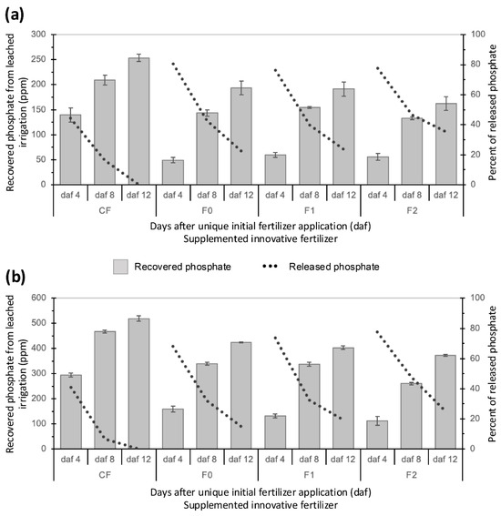 Pi released from innovative fertilizers into the sand–perlite–vermiculite substrate. The bars in the plots indicate the amount of released Pi recovered from the leached water when the fertilizers were supplemented at 250 and 500 ppm ((a,b), respectively). The dotted lines represent the retained Pi in the encapsulated fertilizers over time once the soil reached the maximum water-holding capacity (MWHC).
