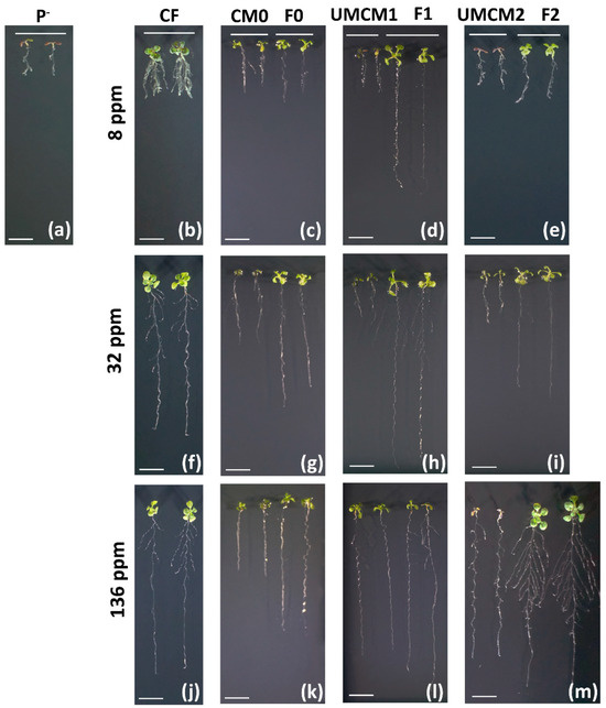 In vitro assay of Arabidopsis thaliana growth and development under treatment with innovative fertilizers. Fifteen-day-old seedings were germinated in MS medium supplemented with the innovative phosphate fertilizers (F0, F1, and F2) or the encapsulant matrices used to formulate them (CM0, UMCM1, and UMCM2, respectively) (c–e,g–i,k–m). As a negative control, A. thaliana seedlings were germinated and grown under phosphate-limited conditions (P−; (a)). The positive control seedlings were supplemented with conventional fertilizer (CF; (b,f,j)). Note that all seedlings that were grown in supplemented media were grown at different concentrations (8, 32, or 136 ppm) of either a fertilizer (CF, F0, F1, or F2) or a chitosan-encapsulated matrix (CM0, UMCM1, or UMCM2). The photographs are representative of at least 15 plants analyzed. Scale bar = 1 cm.