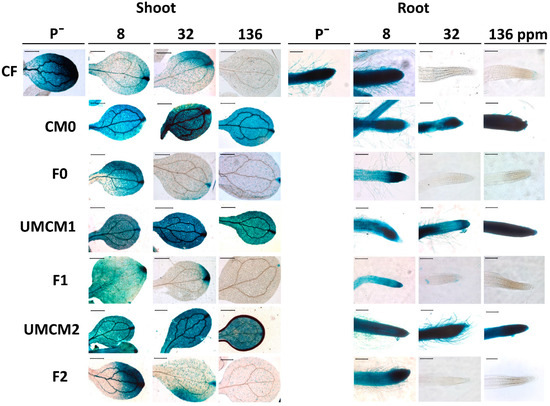 Effects of the innovative fertilizers (F0, F1, and F2) and the encapsulant matrices used to formulate them (CM0, UMCM1, and UMCM2) on the expression of the uidA gene in the AtPT2:uidA A. thaliana transgenic line. As in the assay performed with the A. thaliana wild-type genotype (Figure 6), negative (P−) and positive controls (CF) were also included. The concentrations tested were 8, 32, and 136 ppm of either a fertilizer (CF, F0, F1, or F2) or a chitosan encapsulant matrix (CM0, UMCM1, or UMCM2) added to the culture medium. Histochemical staining of the GUS activity in these 15-day-old AtPT2:uidA seedlings was carried out according to the protocols described in the Section 3. The photographs are representative of at least 20 seedlings analyzed. Scale bar = 500 μM (shoot) and 100 μM (root).
