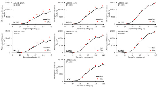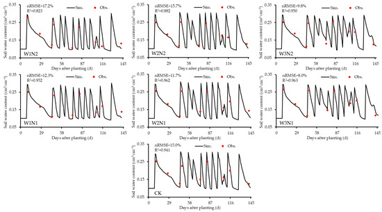In summary, except for the aboveground biomass in the low-water, low-nitrogen treatment (W1N1), the nRMSE for simulating aboveground biomass and soil moisture across all other treatments using the CSM-CROPGRO-Peanut model was less than 20%, with all R2 values exceeding 0.8. These findings confirm that the model meets the requirements for accurately simulating peanut growth and development under mulched drip irrigation conditions in Xinjiang.