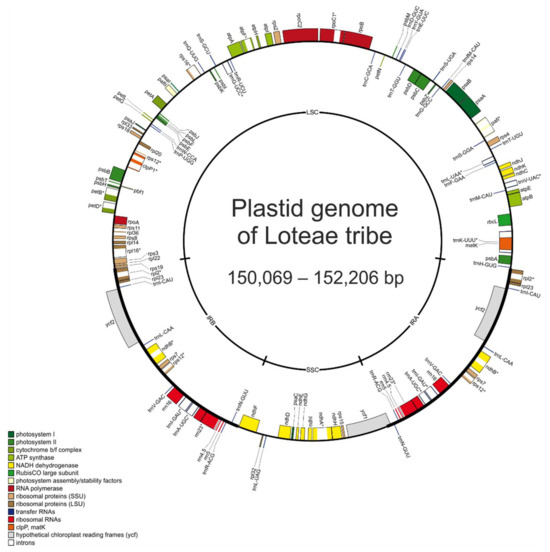 A circular genome map of the Loteae plastid genomes. Genes within the circle are transcribed clockwise, while those outside the circle are transcribed counterclockwise. Genes belonging to different functional groups are shown with various colors. Intron containing genes are marked with asterisks.