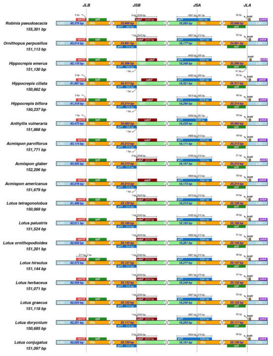 IR-SC junction positions in plastomes of 16 species of Loteae and Robinia pseudoacacia.