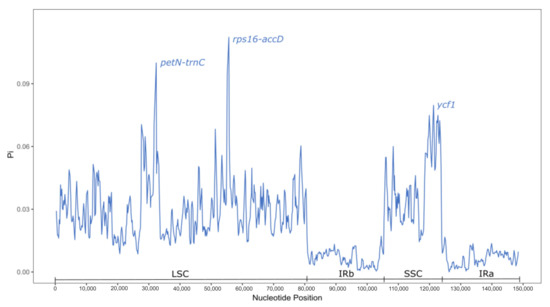 The most variable sites of the studied plastomes were found in the petN-trnC and rps16-accD spacers from the LSC region and in the ycf1 gene within the SSC (Figure 3).