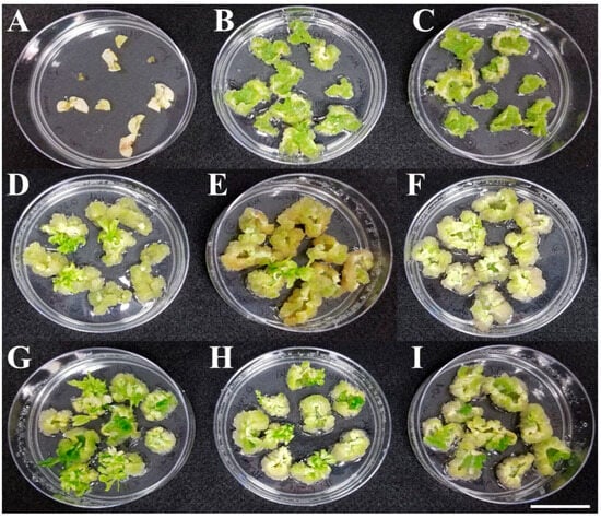 Representative images of the effects of plant growth regulators (PGRs) on callus induction and shoot regeneration from the cotyledon and first leaf explants of 6- or 7-day-old seedlings of non-transgenic lettuce ‘Kahu’ at 28 days after callus induction. Media #1 (A), #2 (B), #3 (C), #4 (D), #5 (E), #6 (F), #7 (G), #8 (H), and #9 (I) with PGR components are listed in Table 1. Each plate is a representative of three replicates for each medium. Bar = 3 cm.