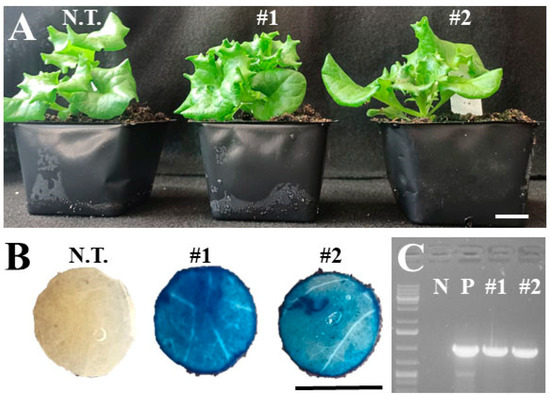 Representative images of constitutive GUS expression in transgenic ‘Red Sails’ lines expressing 35S:GUSPlus. (A) Representative plants of non-transformed (i.e., wild-type) and T1 GUS-positive line #1 and #2. (B) Confirmation of transgene expression using histological GUS staining. (C) PCR amplification of the GUSPlus gene with primers GusPlus-F and GusPlus-R. N.T., non-transformed. N, negative control (water). P, positive control (plasmid). Bar = 1 cm.