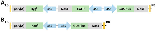 The pGFP-GUSPlus plasmid (hygromycin selection) was obtained from Addgene (plasmid #64401; hygromycin selection), and contains GUSPlus under the control of the 35S promoter with a Nos terminator, eGFP under the control of 35S with a Nos terminator, and HygR under the control of 35S with a CaMV pol(A) signal (Figure 5A).