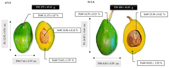 The impact of avocado landraces on the fruit’s traits was assessed through the measurement of weight (FW), length (FL), width (FWi), peel weight (PeW), seed weight (SeW), and pulp weight (PuW). The fruit traits of the LA and CA avocados are shown in Figure 1. The fruit trait measurements indicated that the average weight of CA avocados was 30% higher than that of LA avocados. Both LA and CA avocados were considerably heavier as compared to more common commercial varieties like Hass, which has an average fruit weight of approximately 150 g, as reported by Dreher and Davenpor [14]. In this study, the LA avocados were 150% heavier and the CA avocados were 225% heavier than the Hass variety.
