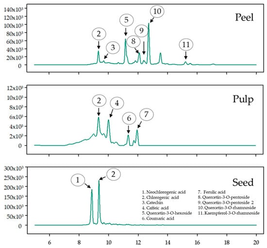 Chromatograms of the main phenolic compounds identified in the peels, pulps, and seeds of avocado landraces obtained by UPLC-DAD/ESI-MS at 350 nm.