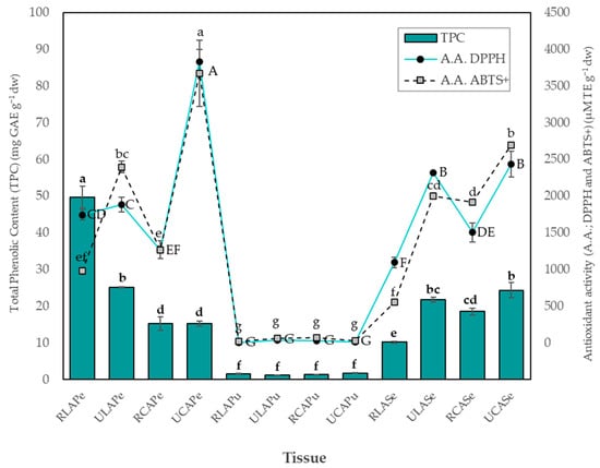 TPC and antioxidant activity against DPPH and ABTS+ radicals of LA and CA tissues. Bars represent the mean ± SD. Different superscript letters (TPC: lowercase bold letter; A.A. DPPH: uppercase letter to the right of the marker; A.A. ABTS: lowercase letter) in the same bar mean significant difference (p ≤ 0.05) by the Tukey test. RLAPe: Ripe Lagunero avocado peel; ULAPe: unripe Lagunero avocado peel; RCAPe: ripe Criollo avocado peel; UCAPe: unripe Criollo avocado peel; RLAPu: ripe Lagunero avocado pulp; ULAPu: unripe Lagunero avocado pulp; RCAPu: ripe Criollo avocado pulp; UCAPu: unripe Criollo avocado pulp; RLASe; ripe Lagunero avocado seed; ULASe: unripe Lagunero avocado seed; RCASe: ripe Criollo avocado seed; UCASe: unripe Criollo avocado seed.