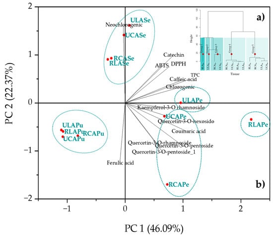 (a) Dendrogram and (b) principal components analysis (PCA) and the projection of variables including TPC, antioxidant activity (DPPH and ABTS+), and phenolic compounds across different ripening stages and tissues of LA and CA. RLAPe: Ripe Lagunero avocado peel; ULAPe: unripe Lagunero avocado peel; RCAPe: ripe Criollo avocado peel; UCAPe: unripe Criollo avocado peel; RLAPu: ripe Lagunero avocado pulp; ULAPu: unripe Lagunero avocado pulp; RCAPu: ripe Criollo avocado pulp; UCAPu: unripe Criollo avocado pulp; RLASe; ripe Lagunero avocado seed; ULASe: unripe Lagunero avocado seed; RCASe: ripe Criollo avocado seed; UCASe: unripe Criollo avocado seed.