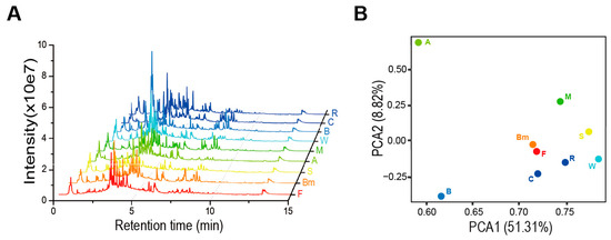 Overview of metabolic variation in nine cereal crops. (A) Total ion chromatography of metabolites in nine cereal crops based on untargeted metabolomics. (B) Principal component analysis (PCA) of all features detected in nine cereal crops. F, foxtail millet; Bm, broomcorn millet; S, sorghum; A, adlay; M, maize; W, wheat; B, barley; C, common oat; R, rice.