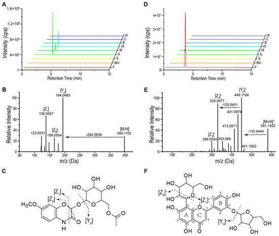 Annotation of CL1148 and CL0463 as HMBOA-acetyl-glucose and C-glucoside luteolin O-pentose, respectively. (A) Extracted ion chromatogram (EIC) of CL1148, a specific metabolite in maize, wheat, and adlay. F, foxtail millet; Bm, broomcorn millet; S, sorghum; A, adlay; M, maize; W, wheat; B, barley; C, common oat; R, rice; Sb, soybean; (B) MS/MS spectra of CL1148, which was identified as HMBOA-acetyl-glucose. (C) Putative fragmentation rules of HMBOA-acetyl-glucose. (D) EIC of CL0463, a specific metabolite in foxtail millet. F, foxtail millet; Bm, broomcorn millet; S, sorghum; A, adlay; M, maize; W, wheat; B, barley; C, common oat; R, rice; Sb, soybean; (E) MS/MS spectra of CL0463, which was identified as C-glucoside luteolin O-pentose. (F) Putative fragmentation rules of C-glucoside luteolin O-pentose.