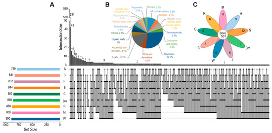 Classification and species distribution of 1131 annotated metabolites. (A) An upset plot of the number of annotated metabolites in nine cereal crops. (B) Classification of annotated metabolites. AA, amino acid; BA, Benzoic acid; HCA, hydroxycinnamic acid. (C) Venn diagram analysis of annotated metabolites. F, foxtail millet; Bm, broomcorn millet; S, sorghum; A, adlay; M, maize; W, wheat; B, barley; C, common oat; R, rice.