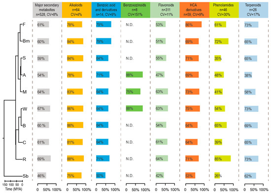 Treemap visualization of major secondary metabolite classes distribution. The lineage divergence time is adopted from the TimeTree database (http://www.timetree.org, accessed on 20 December 2024). F, foxtail millet; Bm, broomcorn millet; S, sorghum; A, adlay; M, maize; W, wheat; B, barley; C, common oat; R, rice; Sb, soybean; MYA, millions of years; N.D., non-detected.