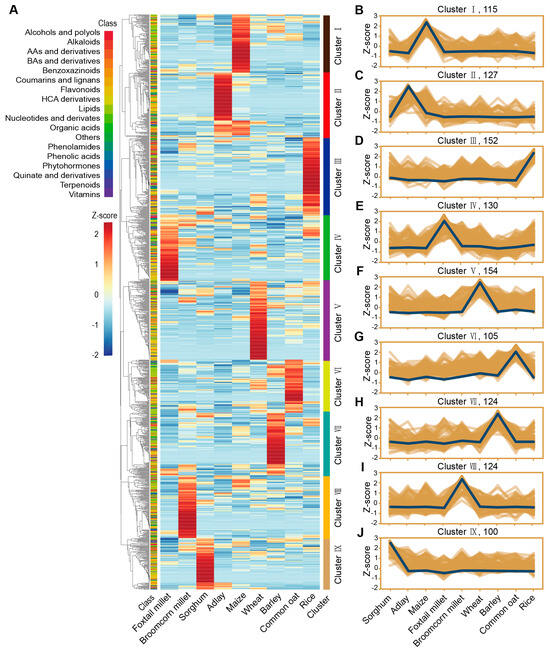 Hierarchical cluster analysis of 1131 annotated metabolites. (A) Hierarchically clustered heatmap of the 1131 annotated metabolites from nine cereal crops. Metabolic data were Z-score standardized (color scale from blue to red). AA, amino acid; BA, Benzoic acid; HCA, hydroxycinnamic acid. (B–J) Accumulation patterns of clusters I to IX. Clusters I to IX were specifically accumulated in maize (115 metabolites), adlay (127 metabolites), rice (152 metabolites), foxtail millet (130 metabolites), wheat (154 metabolites), common oat (105 metabolites), barley (124 metabolites), broomcorn millet (124 metabolites), and sorghum (100 metabolites). The x-axis depicts nine cereal crops, and the y-axis depicts the Z score standardized per metabolite.