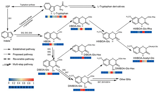 We detected eight benzoxazinoids in maize, wheat, and adlay, among which the synthesis pathways for four compounds—HMBOA-acetyl-glucoside, HMBOA—glucoside-rhamnose, DIBOA-glucoside-hexose, and DIMBOA-glucoside-hexose—had not been identified. Therefore, we reconstructed a pathway (including established and proposed pathways) that includes the eight benzoxazinoids we detected (Figure 6). Considering the difference of one acetyl group, we hypothesize that HMBOA-acetyl-glucoside may be synthesized from HMBOA-glucose through the catalysis of an acetyltransferase. Similarly, HMBOA-glucoside-rhamnose, DIBOA-glucoside-hexose, and DIMBOA-glucoside-hexose are likely formed from their corresponding mono-glycosylated substrates through a single glycosylation reaction. By analyzing the concentrations of metabolites within these pathways, we found that HBOA-glucoside, DIBOA-glucoside, DIMBOA-glucoside-hexose, and DIMBOA-glucoside have relatively higher abundances in maize compared to adlay and wheat. These four metabolites can be synthesized from HBOA through 1–5 reaction steps (Figure 6). Wheat exhibited higher levels of DIBOA-glucoside-hexose and HMBOA-glucoside-rhamnose, while adlay showed higher levels of HBOA and HMBOA-acetyl-glucoside. In conclusion, based on our metabolomic results, we proposed previously unreported steps in the benzoxazinoid biosynthetic pathway and revealed both the similarities and differences of this pathway among maize, adlay, and wheat.