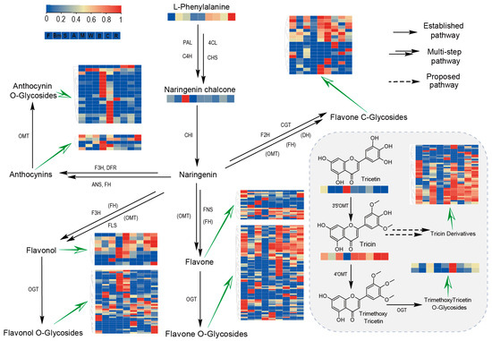 Metabolic pathway analysis for flavonoid biosynthesis. PAL, phenylalanine ammonialyase; 4CL, 4-coumarate-CoA ligase; C4H, cinnamic acid 4-hydroxylase; CHS, chalcone synthase; CHI, chalcone isomerase; F3H, flavonoid 3-hydroxylase; FH, flavonoid hydroxylase; F2H, flavonoid 2-hydroxylase; DH, dehydratase; DFR, dihydroflavonol 4-reductase; ANS, anthocyanin synthase; FLS, flavonol synthase; FNS, flavone synthase; OMT, O-methyltransferase; 3′5′OMT, 3′5′O-methyltransferase; 4′OMT, 4′O-methyltransferase; OGT, O-glycosyltransferase; CGT, C-glycosyltransferase. Parentheses indicate that only a part of the products requires this enzyme.