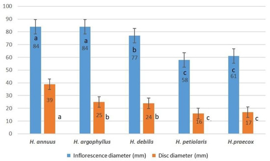 | H. petiolaris | 442.7± 2.9 c (0.9) | 576.9 ± 14.3 c (3.5) | 0.8 ± 0.8 b (4.6) |