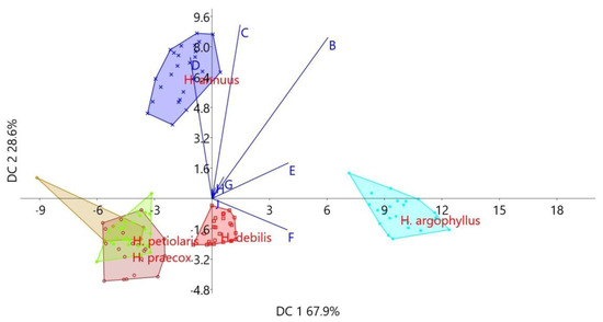 | H. argophyllus | 521.6 ± 1.5 a (0.4) | 885.2 ± 37.7 b (6.0) | 0.6 ± 0.6 c (4.8) |