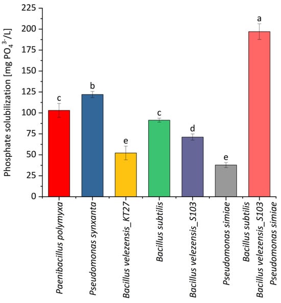 Effects of various microbial preparations on available phosphorus after six days of incubation at 30 °C. Different letters indicate statistically significant differences in mean values based on the LSD test (p < 0.05).
