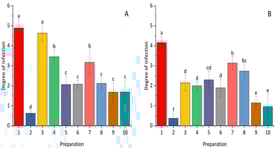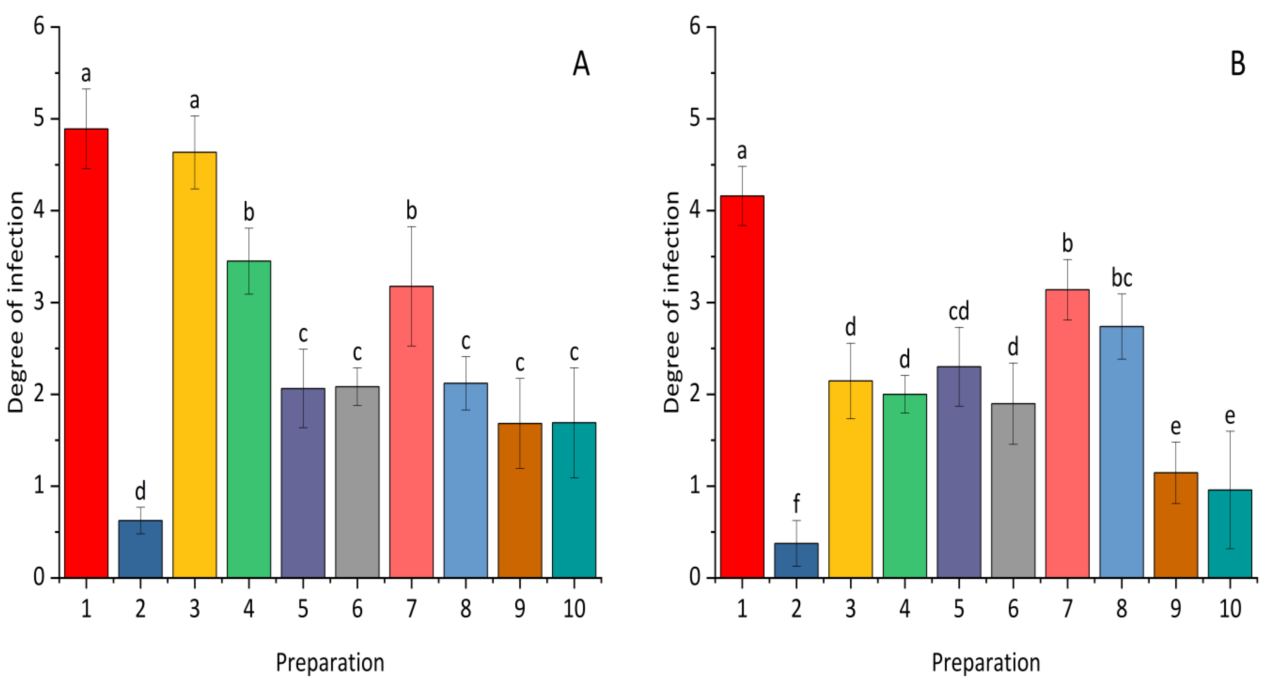 The effect of Bacillus ssp., Paenibacillus ssp., Pseudomonas ssp., or a synthetic fungicide on the degree of infection with Fusarium pathogens in maize (A) and winter wheat (B). 1—control; 2—(0.1 L) prothioconazole; 3 (0.5 L), 4 (1.0 L)—Bacillus velezensis_KT27; 5 (0.5 L), 6 (1.0 L)—Paenibacillus polymyxa; 7 (0.5 L), 8 (1.0 L)—Pseudomonas synxatha; 9 (0.5 L), 10 (1.0 L)—Bacillus subtilis, Pseudomonas simiae, Bacillus velezensis_S103. The doses of the preparations in combinations 1–10 are consistent with the numbers and values given in Section 4. Different letters indicate statistically significant differences in mean values based on the LSD test (p < 0.05).