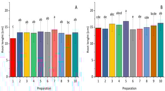 The effect of Bacillus ssp., Paenibacillus ssp., Pseudomonas ssp., or the synthetic fungicide on root length in maize (A) and winter wheat (B) seeds inoculated with Fusarium. 1—control; 2—(0.1 L) prothioconazole; 3 (0.5 L), 4 (1.0 L)—Bacillus velezensis_KT27; 5 (0.5 L), 6 (1.0 L)—Paenibacillus polymyxa; 7 (0.5 L), 8 (1.0 L)—Pseudomonas synxatha; 9 (0.5 L), 10 (1.0 L)—Bacillus subtilis, Pseudomonas simiae, Bacillus velezensis_S103. The doses of the preparations in combinations 1–10 are consistent with the numbers and values given in Section 4. Different letters indicate statistically significant differences in mean values based on the LSD test (p < 0.05).