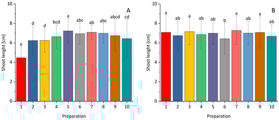 The effect of Bacillus ssp., Paenibacillus ssp., Pseudomonas ssp., or the synthetic fungicide on shoot length of maize (A) and winter wheat (B) seeds inoculated with Fusarium. 1—control; 2—(0.1 L) prothioconazole; 3 (0.5 L), 4 (1.0 L)—Bacillus velezensis_KT27; 5 (0.5 L), 6 (1.0 L)—Paenibacillus polymyxa; 7 (0.5 L), 8 (1.0 L)—Pseudomonas synxatha; 9 (0.5 L), 10 (1.0 L)—Bacillus subtilis, Pseudomonas simiae, Bacillus velezensis_S103. The doses of the preparations in combinations 1–10 are consistent with the numbers and values given in Section 4. Different letters indicate statistically significant differences in mean values based on the LSD test (p < 0.05).