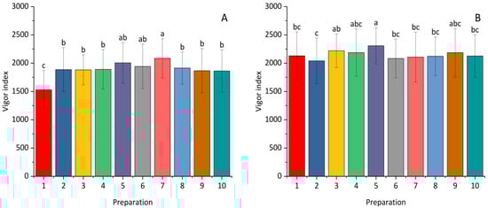 The influence of Bacillus ssp., Paenibacillus ssp., Pseudomonas ssp., or the synthetic fungicide on the vigor index of maize (A) and winter wheat (B) seeds inoculated with Fusarium. 1—control; 2—(0.1 L) prothioconazole; 3 (0.5 L), 4 (1.0 L)—Bacillus velezensis_KT27; 5 (0.5 L), 6 (1.0 L)—Paenibacillus polymyxa; 7 (0.5 L), 8 (1.0 L)—Pseudomonas synxatha; 9 (0.5 L), 10 (1.0 L)—Bacillus subtilis, Pseudomonas simiae, Bacillus velezensis_S103. The doses of the preparations in combinations 1–10 are consistent with the numbers and values given in Section 4. Different letters indicate statistically significant differences in mean values based on the LSD test (p < 0.05).