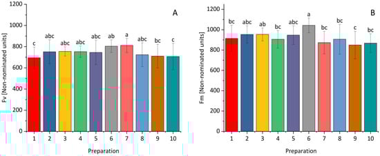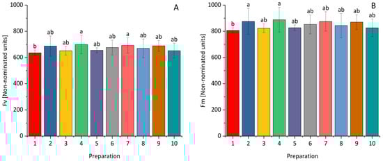 The influence of Bacillus ssp., Paenibacillus ssp., Pseudomonas ssp., or the synthetic fungicide on Fv—variable fluorescence (A) and Fm—maximum fluorescence (B) of maize. 1—control; 2—(0.1 L) prothioconazole; 3 (0.5 L), 4 (1.0 L)—Bacillus velezensis_KT27; 5 (0.5 L), 6 (1.0 L)—Paenibacillus polymyxa; 7 (0.5 L), 8 (1.0 L)—Pseudomonas synxatha; 9 (0.5 L), 10 (1.0 L)—Bacillus subtilis, Pseudomonas simiae, Bacillus velezensis_S103. The doses of the preparations in combinations 1–10 are consistent with the numbers and values given in Section 4. Different letters indicate statistically significant differences in mean values based on the LSD test (p < 0.05).