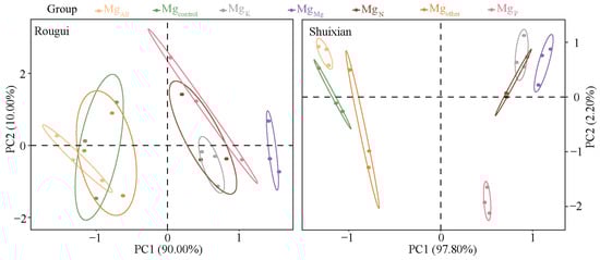 The above analysis revealed that the uptake rate of Mg ions by the tea plant’s root system changed significantly under different nutrient mixtures, which may lead to changes in the accumulation capacity of Mg ions in the tea plant’s root system. Accordingly, the present study further determined the Mg ion content in the tea plant’s root system after treatment with different elements, and the results showed that the Mg ion content in the root system of Rougui was 50.65, 48.56, 104.96, 107.75, 102.83, 52.57, and 137.34 μg/g under seven different treatments (Figure 3A), while the Mg ion content of the root system of Shuixian were 43.20, 40.79, 108.73, 114.19, 105.28, 45.41, and 158.74 μg/g (Figure 3B). The trend of Mg ion content in Rougui and Shuixian root systems under different elements was similar, with MgMg > MgP > MgN > MgK > Mgother > Mgcontrol > MgAll. Secondly, it was found in this study (Figure 3) that the Mg ion content in the root systems of Rougui and Shuixian under different elements was not significantly different between MgAll, Mgcontrol, and Mgother, and was not significantly different between MgN, MgP, and MgK; however, MgMg was significantly greater than MgN, MgP, and MgK, while MgN, MgP, and MgK were significantly greater than MgAll, Mgcontrol, and Mgother. It can be seen that the Mg ion content in the tea plant’s root system was closely related to the rate of Mg ion uptake by the root system. When there were only Mg ions in the solution, the tea plant had a high uptake rate and high demand for Mg ions, and when the uptake reached equilibrium, the tea plant root system had the highest Mg content. When only nitrogen, phosphorus, or potassium ions alone existed in the solution, it could reduce the rate of absorption of Mg ions by the tea plant and reduce the demand for Mg, and when the absorption reached equilibrium, the Mg content of the tea plant root system was lower, but the difference in the effect of nitrogen, phosphorus, or potassium elements on the accumulation of Mg ions in the root system of the tea plant was not significant. Secondly, with the increase in ionic types, the rate of Mg ion uptake by tea plants gradually decreased, demand decreased, and accumulation showed a decreasing trend. In addition, it was found in this study (Figure 3C) that the difference in Mg ion content in Rougui roots under different elements ranged from −2.09 to 86.69 μg/g, while that of Shuixian ranged from −2.41 to 115.54 μg/g, using Mgcontrol as a control. It can be seen that the intensity of the effect of different elements on the Mg ion content of the Rougui root system was low, while the effect on Shuixian was high.