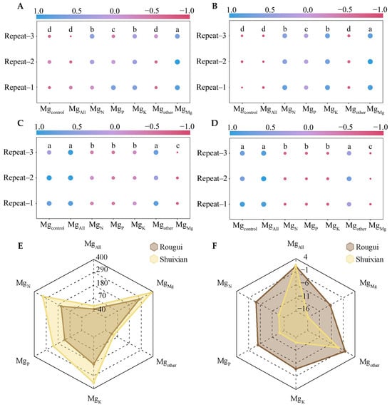 Analysis of the kinetic parameters of Mg ion uptake in the tea plant’s root system under different elements. Note: Mgcontrol is tea plant seedlings transplanted to complete nutrient solution without starvation treatment; MgAll is tea plant seedlings transplanted to complete nutrient solution after starvation treatment; MgN, MgP, and MgK are starvation-treated tea seedlings transplanted into Mg ion culture medium containing only N, P, or K, respectively; and Mgother is starvation-treated tea seedlings transplanted to complete nutrient solution without N, P, and K; MgMg is starvation-treated tea plant seedlings transplanted to a culture solution containing only Mg ions; (A) maximum Mg ion uptake rate (Imax) of Rougui root system; (B) maximum Mg ion uptake rate (Imax) of Shuixian root system; (C) Mg ion concentration in the solution when the Mg ion uptake rate of Rougui root system is zero (Cmin value); (D) Mg ion concentration in the solution when the Mg ion uptake rate of Shuixian root system is zero (Cmin); (E) difference between Imax value of Rougui or Shuixian root system under different elements (▲Imax), using Mgcontrol as control; (F) difference between Cmin value of Rougui or Shuixian culture solution under different elements (▲Cmin) using Mgcontrol as control; different lowercase letters indicate that the differences between different treatments reached the p < 0.05 level.