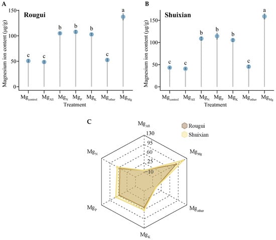 Analysis of Mg content in the tea plant’s root system under different elements. Note: Mgcontrol is tea plant seedlings transplanted to complete nutrient solution without starvation treatment; MgAll is tea plant seedlings transplanted to complete nutrient solution after starvation treatment; MgN, MgP, and MgK are starvation-treated tea seedlings transplanted into Mg ion culture medium containing only N, P, or K, respectively; and Mgother is starvation-treated tea seedlings transplanted to complete nutrient solution without N, P, and K; MgMg is starvation-treated tea plant seedlings transplanted to a culture solution containing only Mg ions; (A) Mg content of Rougui root system; (B) Mg content of Shuixian root system; (C) changes in Mg content of Rougui and Shuixian root systems under different elements compared to the control; different lower-case letters indicate that the differences between treatments reached the p < 0.05 level.