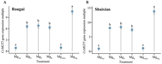 Analysis of CsMGT5 gene expression in tea plant root system under different elements. Note: MgAll is tea plant seedlings transplanted to complete nutrient solution after starvation treatment; MgN, MgP, and MgK are starvation-treated tea seedlings transplanted into Mg ion culture medium containing only N, P, or K, respectively; and Mgother is starvation-treated tea seedlings transplanted to complete nutrient solution without N, P, and K; MgMg is starvation-treated tea plant seedlings transplanted to a culture solution containing only Mg ions; (A) fold expression of CsMGT5 gene in Rougui root system compared with the control; (B) fold expression of CsMGT5 gene in Shuixian root system compared with the control; different lowercase letters indicate that the differences between treatments reached the p < 0.05 level.