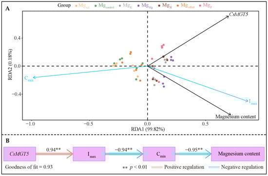 Redundancy analysis of the kinetic parameter indexes of Mg ion uptake, Mg content and CsMGT5 gene expression in the tea plant’s root system under different elements showed that (Figure 5A), the Imax value of Mg ion uptake in the tea plant’s root system was significantly correlated with the Mg ion content, and gene expression of CsMGT5. The PLS-SEM equations for the kinetic parameter indicators of Mg ion uptake, Mg content and CsMGT5 gene expression in tea plant root system were further constructed, and the results showed (Figure 5B) that the CsMGT5 gene expression in the tea plant’s root system positively regulated the Imax value (0.94 **), the Imax value negatively regulated the Cmin value (−0.94 **), and the Cmin value negatively regulated the Mg content (−0.95 **). It is evident that the enhanced expression of CsMGT5 gene in the tea plant’s root system could increase the absorption rate of Mg ions in the tea plant’s root system which, in turn, reduced the concentration of Mg ions in the culture broth and improved the Mg content in the tea plant’s root system.