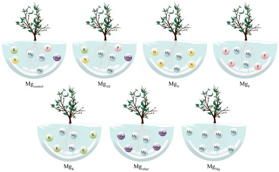 Experimental design of ion depletion. Note: Mgcontrol is tea plant seedlings transplanted to complete nutrient solution without starvation treatment; MgAll is tea plant seedlings transplanted to complete nutrient solution after starvation treatment; MgN, MgP, and MgK are starvation-treated tea seedlings transplanted into Mg ion culture medium containing only N, P, or K, respectively; and Mgother is starvation-treated tea seedlings transplanted to complete nutrient solution without N, P, and K; MgMg is starvation-treated tea plant seedlings transplanted to a culture solution containing only Mg ions.