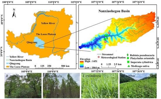 The Nanxiaohegou Basin (NXHG Basin) (107°30′–107°37′ E and 35°41′–35°44′ N, 36.2 km2), a typical semi-arid rain-fed area, was selected for this study. The basin is located in the central part of the Loess Plateau (Figure 1). It is a soil and water conservation pilot and demonstration area selected by the Yellow River Conservancy Committee. The region has a typical warm-temperate continental climate, with an average annual precipitation of 546.7 mm (1970–2020), of which more than 84.9% is due to short rainstorms during the growing season (15 April to 15 October each year). After more than 72 years of management practices, the vegetation cover increased from 1.3% in 1954 to 39.28% in 2020, with the main tree species including Robinia pseudoacacia (R. pseudoacacia), Platycladus orientalis (P. orientalis), and a small number of economic forests such as peach and jujube. The main grasses include Imperata cylindrica (I. cylindrica, natural grassland) and Medicago sativa (M. sativa, artificial grassland). The basin is geologically homogeneous, and the dominant soil type is loess, which can reach depths of 50 to 200 m. Influenced by long-term soil erosion, the main landforms in the basin include loess, rounded slopes, and gullies.