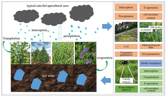 Researchers have conducted extensive studies focusing on various aspects, including the GW footprint of different crops and vegetation, the temporal and spatial variations in distribution, as well as the response of GW to changing environmental conditions [,,,,,]. Previous studies, however, have been largely independent, focusing primarily on water use patterns and their biophysical regulatory processes of vegetation in relation to soil moisture variations across regions. Their methodologies and conclusions vary widely, potentially hindering decision-making processes. To obtain valid information, it is essential to adhere to controlled variables (e.g., similar planting density, tree age, inflow, and soil properties). Consequently, pot experiments are often employed for studying multiple typical vegetation GW in the same region, lacking field-based research with uniform standards. Moreover, possibly due to the convenience of watershed-scale studies, existing research on green water components (GWCs) is somewhat simplistic. In these studies, GW is typically categorized into GW flow (evapotranspiration) and GW storage (soil moisture) and managed through soil moisture conservation, vapor transfer optimization, and water-saving measures [,]. However, GW flow can be further divided into evaporation and transpiration, which evidently differ in their support efficiency for vegetation. Some scholars have recognized this issue [,], further segregating GW flow into high-efficiency green water (GWH) and low-efficiency green water (GWL). Nevertheless, they have overlooked the interception of vegetation, neglecting its potential for GW conversion. Regarding GW storage, a pivotal oversight lies in the disregard for the fact that the portion of water residing below the wilting point is inaccessible for plant absorption and utilization, thereby resulting in an inflated assessment of GW availability. Consequently, to attain accurate management of GW resources, it is imperative that a novel methodology for categorizing GWCs be introduced.