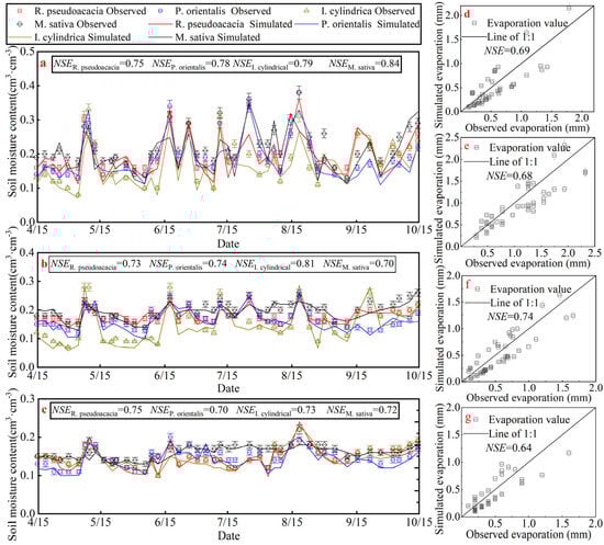 Model validation results for soil moisture content and soil evaporation in four plots. (a–c) are measured, simulated, and NSE of soil water content at 20, 70, and 160 cm depths of the four sample plots, respectively; (d–g) are measured, simulated, and NSE of soil evapotranspiration for R. pseudoacacia, P. orientalis, I. cylindrica, and M. sativa, respectively.