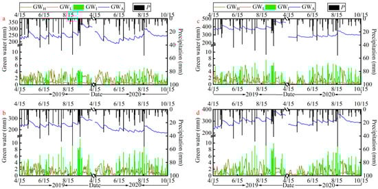 For grasses, I. cylindrica (Figure 4c) had day-by-day GWH distributions of 0.3–6.0 and 0.0–5.3 mm, GWL distributions of 0.1–3.8 and 0.1–2.2 mm, GWI distributions of 0.1–7.6 and 0.1–6.7 mm, and GWA distributions of 360.3–474.2 and 267.2–352.8 mm over the two experimental growing seasons. M. sativa (Figure 4d) had four GWCs quantities distributed at 0.1–5.3 and 0.2–4.5 mm, 0.1–3.0 and 0.1–1.8 mm, 0.1–10.3 and 0.1–9.9 mm, and 234.4–387.0 and 260.0–361.0 mm, respectively, over two growing seasons. In terms of the mean values, the GWL and GWA of I. cylindrica in the 2019 growing season were greater than that of M. sativa, and the GWH and GWI were slightly lower than that of M. sativa. In the 2020 growing season, the GWL of I. cylindrica was still greater than that of M. sativa, while GWA, GWH, and GWI were lower than that of M. sativa. Comparing the quantities of each GWC in both I. cylindrica and M. sativa plots separately, it can be found that the quantities of all three GWCs except GWI were higher in 2019 than in the 2020 growing season, especially in the GWA of I. cylindrica.