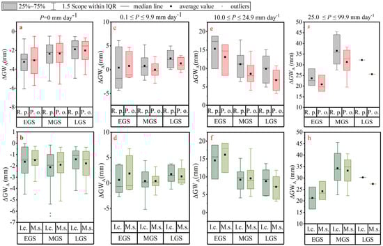 Variation in available green water storage for each sample plot. (a–h) show the change in GWA for woodland sample plots (R. pseudoacacia and P. orientalis) and grassland sample plots (I. cylindrica and M. sativa) for rain-free days, light rain, moderate rain, and heavy rain or more in the early, middle, and late growing seasons, respectively. Box plots show the median, quartiles, and possible outliers of the data. The boundaries of the box are the 25th and 75th percentiles, and the box whisker extends to a range within 1.5 IQR (Interquartile Range). Data points that extend beyond this range are individually marked on the box plot as potential outliers. Note change in scale for each rainfall amount.