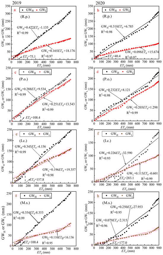 Cumulative plots of GWH, GWL, and potential evapotranspiration. (a,c,e,g) and (b,d,f,h) are plots for R. pseudoacacia, P. orientalis, I. cylindrica, and M. sativa for the 2019 and 2020 growing seasons, respectively. Cumulative values in the plots were recorded every five days, and the intersection of the two fitted lines in the plots represents the point at which the cumulative values of GWH and GWL are equal in magnitude as ET0 increases.