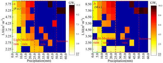 Thermogram of GWI versus rainfall and LAI ((a) is P. orientalis sample plot, (b) is M. sativa sample plot).
