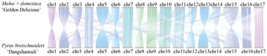 Gene annotation files and protein sequence files were prepared, and the Python (v3.11) of the MCScan program, JCVI, was utilized to perform sequence alignments between Pyrus bretschneider ‘Dangshansuli’ and Malus × domestica ‘Golden Delicious’. Similar sequences were identified, collinear regions were determined, and they were combined into syntenic blocks. The conservation of chromosomal regions between different species or individuals was assessed by examining whether the order and orientation of genes within the syntenic blocks were consistent across different species. Synteny analysis can aid in understanding evolutionary events such as genome duplication, recombination, and inversion.