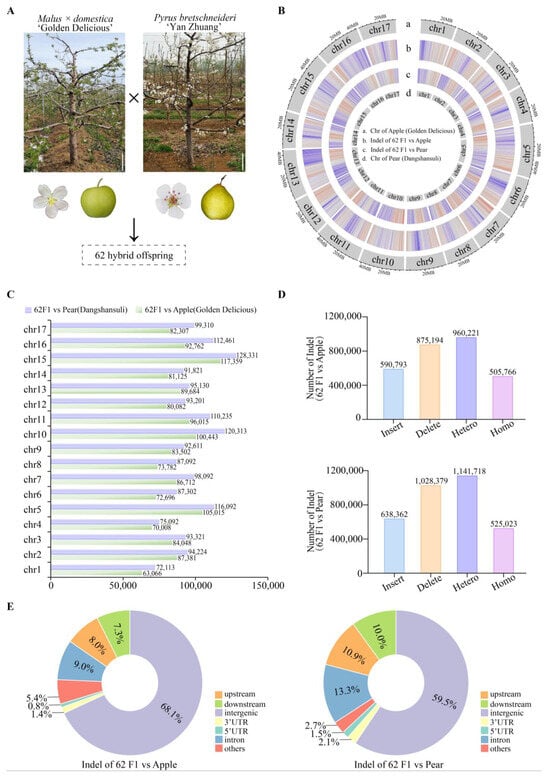 Sequencing population construction and whole-genome genetic variation analysis. (A) Total of 62 hybrid offspring were generated from the cross between the apple cultivar ‘Golden Delicious’ and the pear cultivar ‘Yan Zhuang’. Bar, 0.5 m. (B) Genomic variation circle plot of resequencing offspring. a: chromosome of apple reference genome ‘Golden Delicious’, b: InDel of 62F1 vs. apple, c: InDel of 62F1 vs. pear, d: chromosome of pear reference genome ‘Dangshansuli’. The red line indicates higher InDel density, while the blue line indicates lower InDel density. (C) The distribution of InDels on the chromosomes. (D) Type statistics of InDel variations. (E) Distribution of InDels in different gene regions.