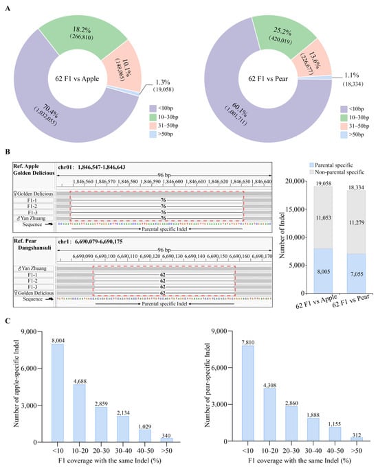 Development process of identification markers for offspring from distant hybridization. (A) InDel length classification of 62F1 vs. apple (left) and 62F1 vs. pear (right). (B) IGV visualization for identifying parental-specific InDels, as shown in the figure, a 76 bp apple-specific InDel and a 62 bp pear-specific InDel (left) and the corresponding parental-specific InDel statistical data (right). (C) F1 coverage with the same InDel of apple-specific InDel (left) and pear-specific InDel (right) in offspring.