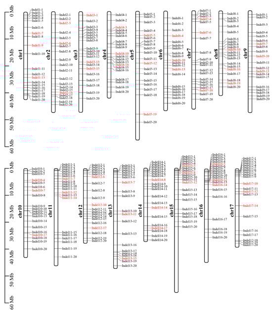 Distribution of 340 InDel markers on each chromosome. InDel marker names are listed to the right of the chromosomes. The ruler label to the left of chromosomes represents the physical distance. The red markers indicate 51 valid InDel markers.