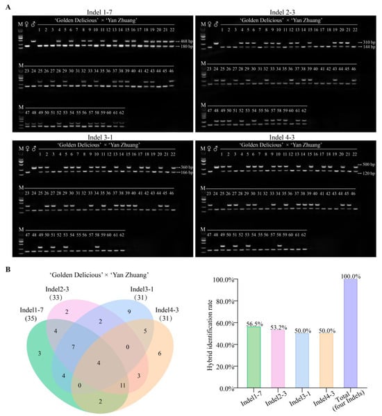 The 340 apple-specific InDels were evenly distributed across all 17 chromosomes, demonstrating the comprehensiveness of the markers (Figure 4). PCR primers were designed targeting these InDels (Table S1). Polymorphism identification of parental PCR markers revealed that 284 pairs of primers successfully amplified in both parents, with 128 pairs of primers producing polymorphic amplification, which could be further utilized for hybrid offspring identification, achieving a marker development efficiency of 45.1%. The offspring marker polymorphism PCR identification ultimately confirmed the effectiveness of 51 pairs of primers, which were able to authenticate all 62 offspring as true hybrids. Among these, InDel1-7, InDel2-3, InDel3-1, and InDel4-3 had the highest identification efficiency, identifying 35, 33, 31, and 31 true hybrids, respectively, with the combined use of these four primer pairs achieving a 100% identification rate (Figure 5).