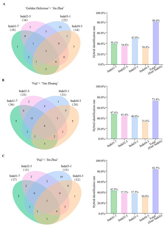 To validate the universality of the markers, we further tested the identification efficacy of 51 InDel markers in three additional hybrid populations with different genetic backgrounds of apple and pear crosses. The results indicate that in the ‘Golden Delicious’ × ‘Jin Zhui’ population (46 offspring), ‘Fuji’ × ‘Yan Zhuang’ population (76 offspring), and ‘Fuji’ × ‘Jin Zhui’ population (40 offspring), there were 45, 39, and 36 pairs of primers exhibiting polymorphism, respectively, with a primer universality rate exceeding 70% (Table 3). Additionally, 38, 61, and 35 hybrid individuals were identified in each population, with hybridization rates of 82.6%, 80.3%, and 85.0%, respectively. Similarly, the four primer pairs InDel1-7, InDel2-3, InDel3-1, and InDel4-3 showed the highest identification efficiency, and their combined use achieved identification rates of 80.4%, 72.4%, and 82.5% in the ‘Golden Delicious’ × ‘Jin Zhui’, ‘Fuji’ × ‘Yan Zhuang’, and ‘Fuji’ × ‘Jin Zhui’ populations, respectively (Figure 6 and Figures S1–S3).