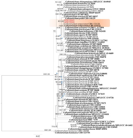 Newly produced sequences were searched in the BLASTn tool and preliminarily identified at the genus level. Reference sequences (Colletotrichum: ITS, gapdh, chs, act, and tub regions; Curvularia: ITS, gapdh, and tef regions; Diaporthe: ITS, tef, tub, cal, and his regions) were downloaded based on the Blastn results and previous studies. Representative strains, including the ex-type of each species of Curvularia, were used for analyses, and for Colletotrichum and Diaporthe, representative strains from each species complex or section were selected to make preliminary analyses to estimate the species complex or section of the isolates obtained in this study. Newly produced sequences were aligned with reference sequences using MAFFT version 7 (http://mafft.cbrc.jp/alignment/server/, accessed on 28 August 2024) [66] and adjusted manually using BioEdit v7.0.9.0 [67]. Automatic alignments of the datasets were trimmed using trimAl v1.2 [68]. Aligned gene regions were concatenated for the analysis using BioEdit v7.0.9.0.