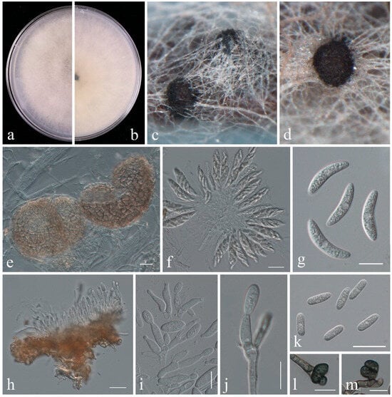 Colletotrichum temperatum (JZB330444). (a) an upper view of colonies on the PDA; (b) reverse view of colonies on the PDA; (c–e) ascomata; (f) asci; (g) ascospores; (h) section view of acervulus; (i,j) conidiophores; (k) conidia; (l,m) appressoria. Scale bars: (e,f,h,k) =20 μm; (g–j,l,m) =10 μm.